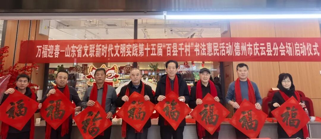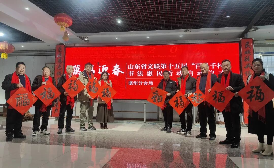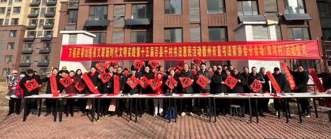 在德州德城区广川街道办事处岔河社区,德州市委宣传部副部长、市文联党组书记李文豪,市文联党组成员、副主席盖其栋,德城区政协副主席、德城区文联主席周林静,德州市书协主席张春晓,德城区文联党组书记曹东昱,德城区广川街道党工委书记、一级主任科员王新,德城区广川街道党工委委员宋文慧,德州市书协李寿山、陈彦豪、闫长军、王志、肖龙、仝传刚、周德立、杨宝波、李云霞、宋红心、王连和、周继东等书法家以及当地群众共500余人参加了分会场启动仪式。市直书协、德城区、陵城区、禹城市、乐陵市、宁津县、临邑县、平原县、武城县、夏津县、庆云县均同步开展活动,共有300余位书法家在3个小时内创作了7200余副春联,12000多个“福”字,430余件书法作品,开展了13次书法大讲堂。