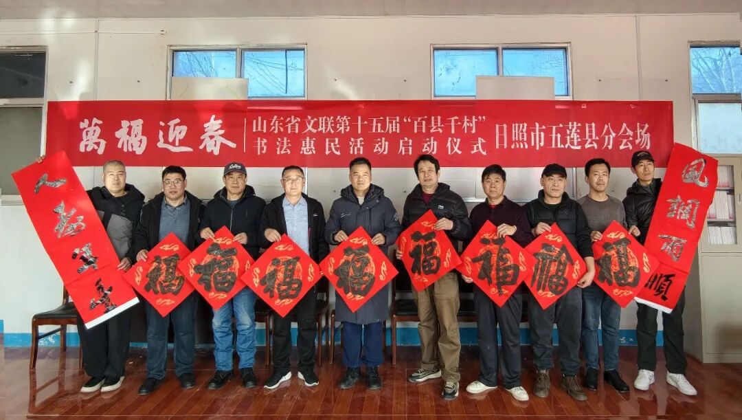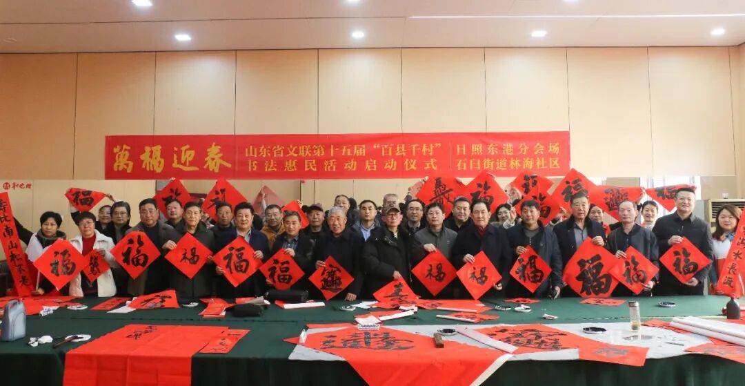 在日照街道迎宾社区,日照市文联党组书记、主席韩通,市文联党组成员、副主席、二级调研员孟云,市文联党组成员、副主席骆道营,市文联副主席、市书协主席丁履磊,东港区区委常委、宣传部部长、统战部部长赵慧,东港区文联主席刘伟,东港区日照街道党工委副书记、办事处主任闫力,市书协副主席林玉柱、郑罡、赵波、高华松、刘玉明、魏会昌,市书协监事会副主席高霞、陈为森,市书协主席团委员李成峰、王波、张迪、李洪宜,市书协秘书长徐磊,市书协监事会秘书长陈德时,常务副秘书长徐立峰,副秘书长赵伟、当地书法骨干管朔、李晓红、于晓晴、庄春、李嘉博、沈名福、刘召海、王良允、宋洪茂、商庆国、丁海霞、尹茂聚、吴立彬、张守文、苗国祎、刘玉华、马德志,迎宾社区有关部门负责人及当地群众300余人参加了分会场启动仪式。东港区、岚山区、莒县、五莲县、经济技术开发区、山海天旅游度假区、高新区均同步启动活动,共有100多位书法家在3个小时内创作了2100余副春联,13500个“福”字。