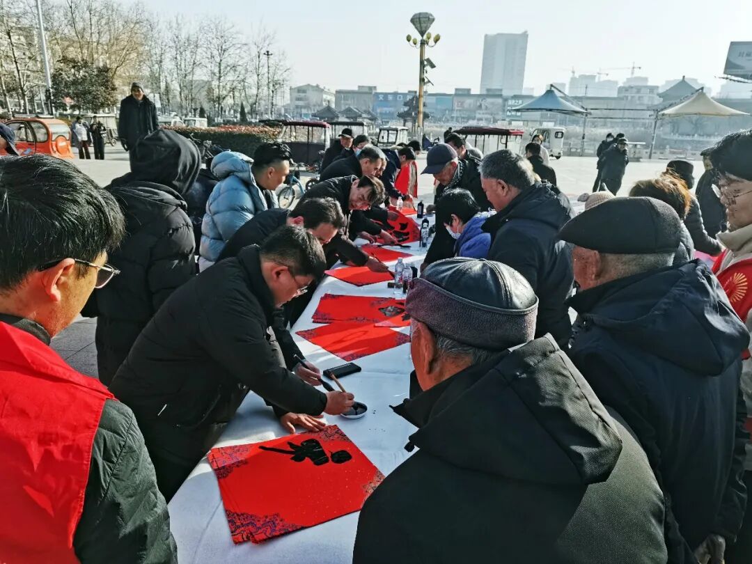 在聊城江北水城旅游度假区湖西街道端庄社区,市文联副县级干部白忠海,度假区党工委委员、服务中心党总支书记、主任李相忠,湖西街道党工委书记高志骞,山东省书协副主席、市书协主席方建光,市书协副主席韩坤峰、李永辉、刘胜民、宋来胜、王洪飞、马振北,市书协秘书长陈飞等20余名书法家以及当地群众共100余人参加了分会场启动仪式。东昌府区、开发区、高新区、茌平区、临清市、高唐县、东阿县、冠县、莘县、阳谷县同步开展活动,共有100余位书法家在2个小时内创作了2000余副春联,3600余个“福”字,160件书法作品,开展了5次书法大讲堂。