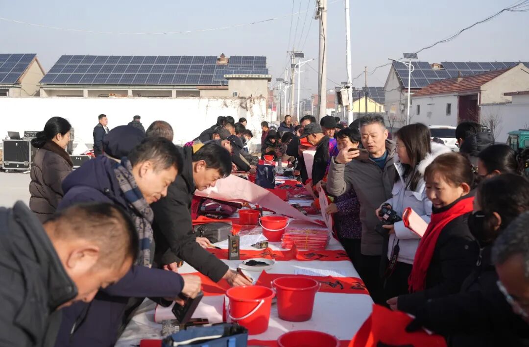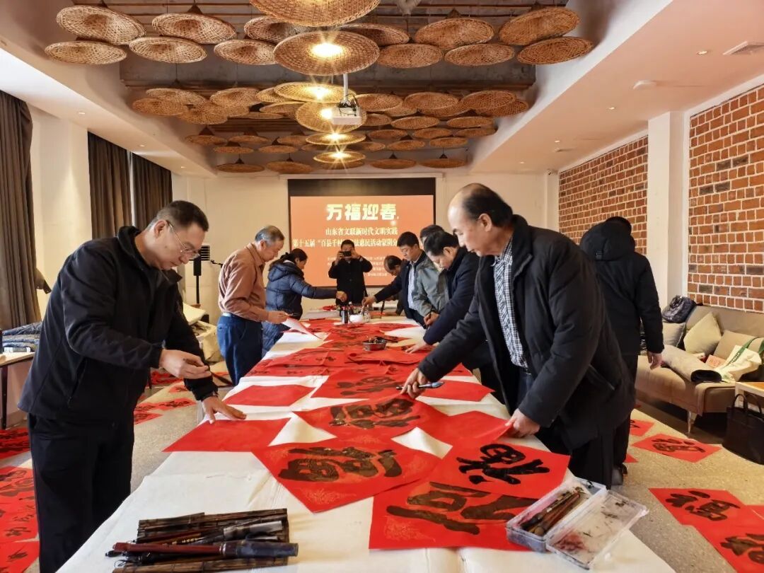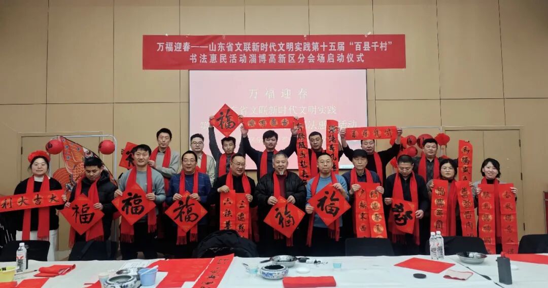 在淄博张店区马尚街道钱家村,淄博市文联党组副书记、副主席吕德民,张店区委宣传部分管日常工作的副部长牟晓宇,淄博市文联副主席、市书协主席孙希民,张店区文联主席胡浩林,张店区马尚街道钱家村党支部书记彭军,淄博市书协副主席宋道永、巩绪发、王培伟、杨守华、刘正瑞、张伯祥、曹仕强、刘上林,淄博市青年书协副主席李小帅、陈炀、陈琪,淄博市书协高金成以及当地群众共200余人参加了分会场启动仪式。张店区、淄川区、博山区、周村区、临淄区、桓台县、高青县、沂源县、高新区均同步开展活动,共有100余位书法家在3个小时内创作了2000余副春联,5000多个“福”字,500余件书法作品。