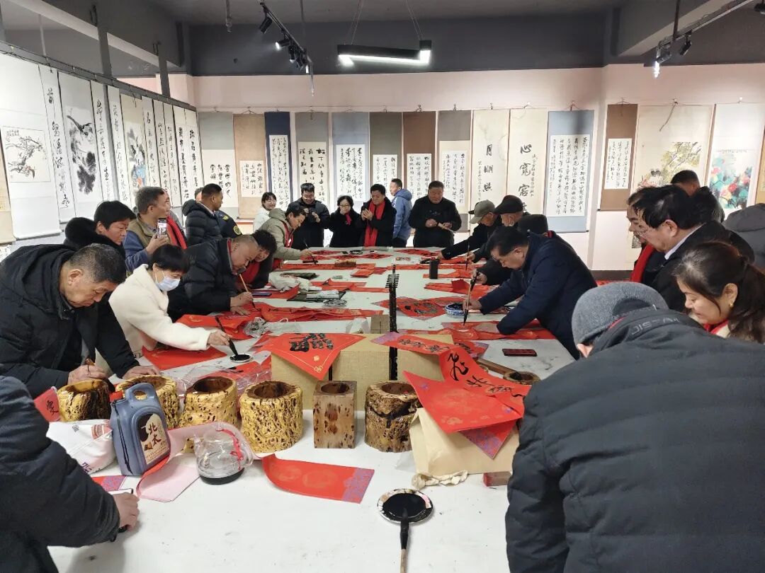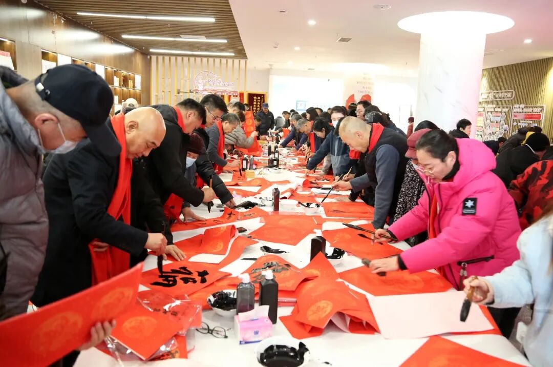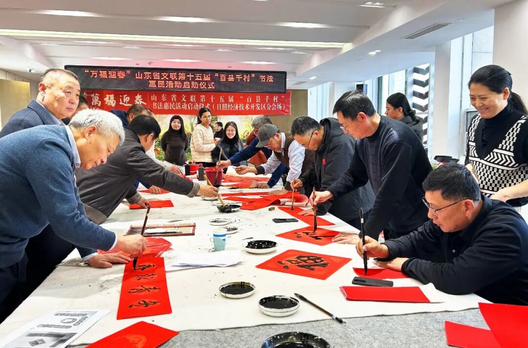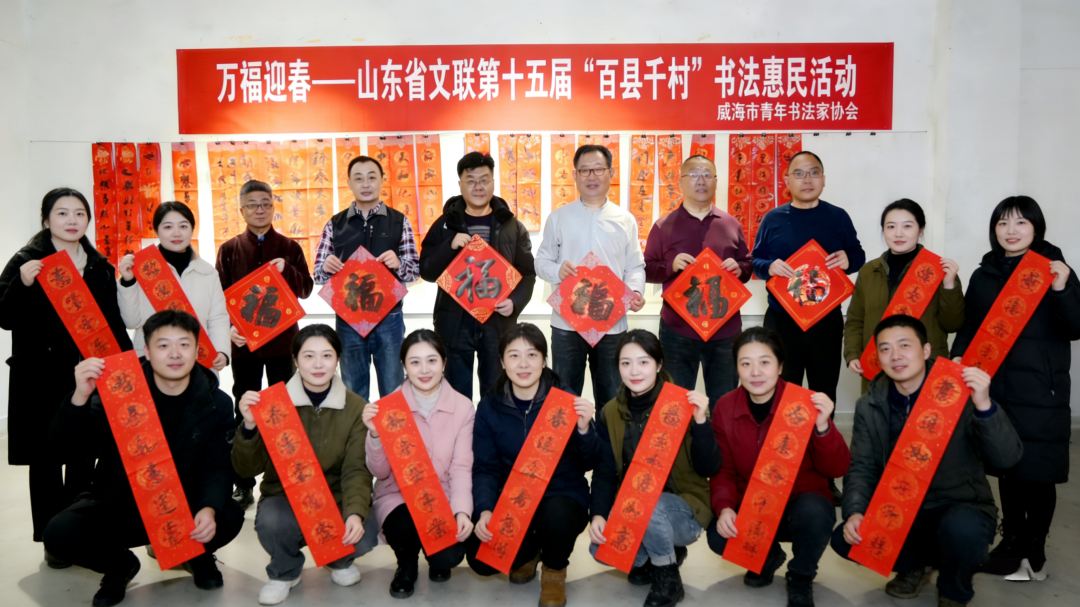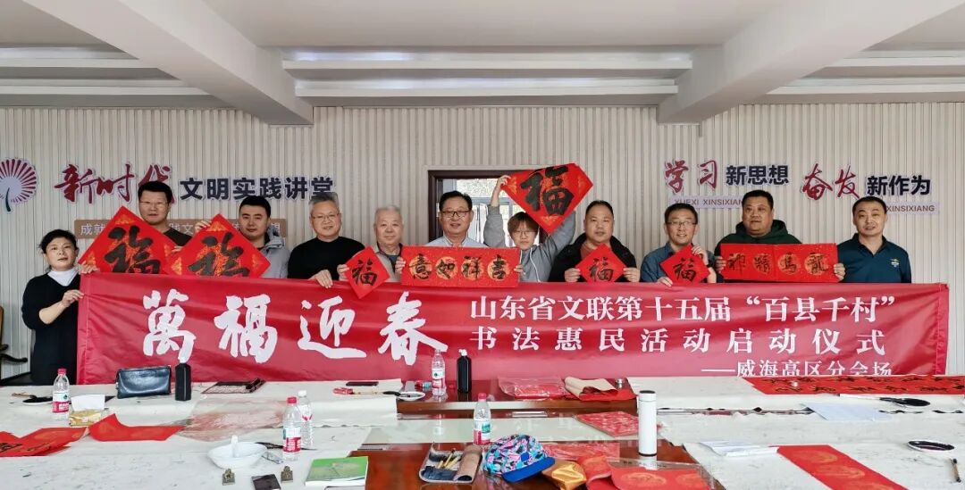 在威海侨乡集团,威海市文联党组书记、主席苗家,威海市书协主席、威海美术馆馆长、威海画院院长邹本虹,侨乡集团总经理姜兵等参加启动仪式。苗家、邹本虹、贾文、刘胜启、林栋、兰洪元、张建伟、李雅楠、刘少杰、李振刚等十余位书法家满怀热情,挥毫泼墨。环翠区、文登区、荣成市、乳山市、经区、高区、临港区书协以及市青年书协同步启动活动。累计书写春联2300余副,“福”字5500余个。此外,市书协精心准备350余套福字挂历礼包,悉数赠予现场百姓,受到群众欢迎,现场洋溢着欢乐祥和的新春氛围。