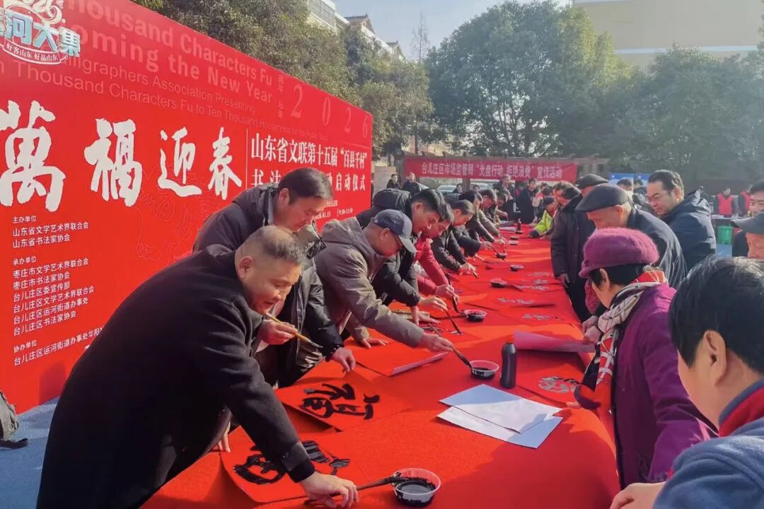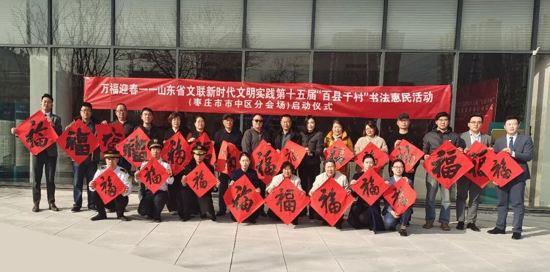 在枣庄台儿庄区运河街道办事处华阳社区居委会,枣庄市文联党组书记、主席李景龙,市文联党组成员、市文艺事业发展中心主任甘真,市文联党组成员、副主席、市文艺志愿者协会主席张灿森,山东省书协理事、枣庄市书协主席马德田,台儿庄区运河街道党工委副书记、办事处主任姜伟,市书协副主席、台儿庄区书协主席刘光,当地书法骨干和群众共500余人参加了分会场启动仪式。市中区、山亭区、滕州市、薛城区、峄城区、高新区均同步开展活动,全市共有200余位书法家在4小时内创作了4000余副春联、20000余个“福”字、430余件书法作品。
