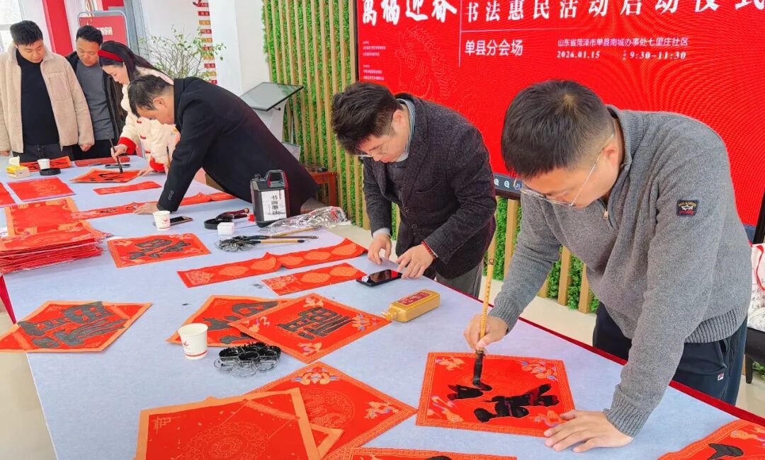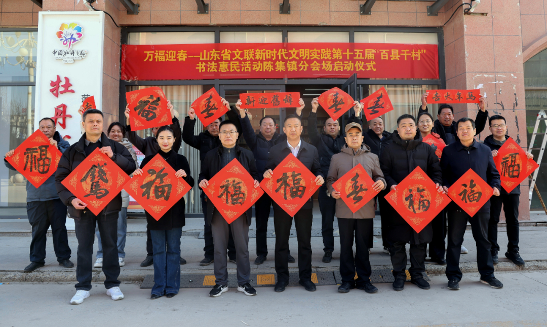 在菏泽成武县天宫庙镇刘楼村康和苑社区广场,菏泽市文联党组书记、主席田继雷,市书协主席鲁世杰,成武县委常委、政法委书记张伟,成武县委常委、宣传部部长李景雷,成武县文联主席张天杰,市书协副主席谢瑞、张海同、刘鲁旭、成文政、于海娟、张国帅,市书协秘书长张伟杰,副秘书长穆青、李明涛、韩旭,菏泽学院美术与设计学院办公室主任李海忠,天宫庙镇党委书记郭建德,成武县书协主席团成员以及当地群众共1000余人参加了分会场启动仪式。牡丹区、定陶区、鲁西新区、曹县、单县、巨野县、郓城县、鄄城县、东明县分会场均同步开展活动,全市共有500余位书法家在2个小时内创作了7000余副春联,10000多个“福”字,150余件书法作品,开展了1次书法大讲堂。