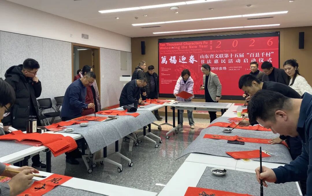 在山东工艺美术学院文化创意产业园会议室,山工艺资产管理处处长张振羽,财务处处长滕丕强,后勤管理处处长杨亚波,后勤管理处副处长孙春波,资产管理处副处长、文化创意产业园办公室主任尹怡朋,建筑与景观设计学院院长李文华,党总支书记姬升果、副院长胡英盛,党总支副书记姜华,资产处房产科科长韩英杰,山东省教育书协副秘书长刘金锋、翟圣亮、潘锐、梁成立,济南大学教授王书峰,山东工艺美院教授陈锋、徐学炳、朱员,山东工艺美院后勤员工等30余人参加分会场启动仪式。现场,8位书法家在3个小时内共创作了200余副春联,500多个“福”字,60余件书法作品。(山东省书法家协会)