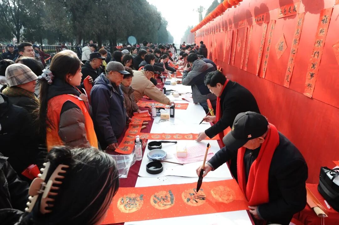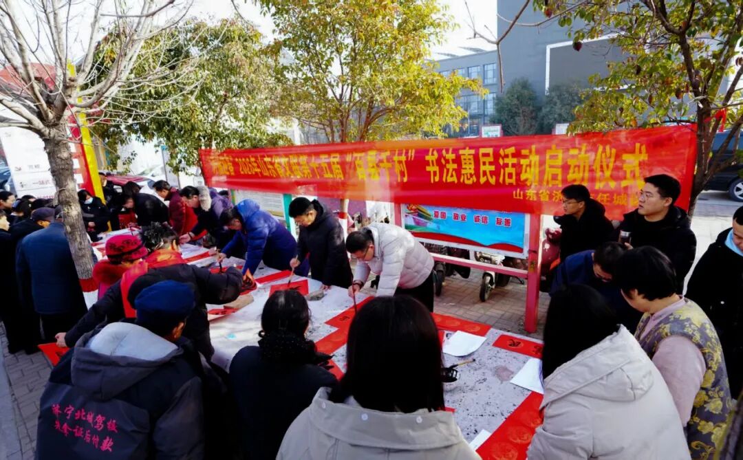 在曲阜万仞宫墙前广场,中国书协、山东省书协、济宁市书协、曲阜市书协等四级协会的40名书法家与10名优秀青少年书法作者共同挥毫泼墨,为群众书写春联和“福”字。红纸墨香间,书家们以笔墨传递祝福,群众热情参与、有序领取,场面喜庆热烈。济宁市书协团体会员任城区、兖州区、邹城市、梁山县、汶上县、金乡县、嘉祥县、鱼台县、微山县、泗水县书协同步启动活动。全市共派出书法家200余人次,创作了3720副春联,9330个“福”字,130件书法作品,开展了6次书法大讲堂,活动共惠及基层群众约4万人。
