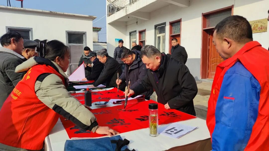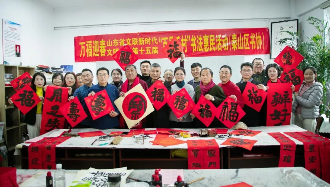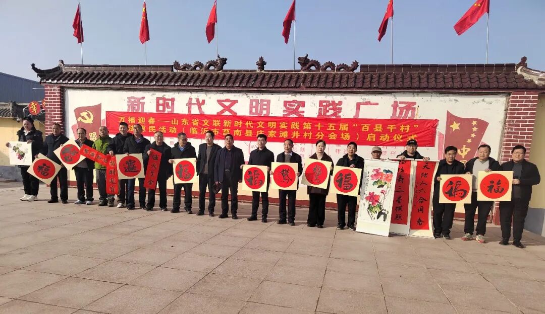 在临沂郯城县马头镇马东村,市文联党组成员、副主席于泳,省书协顾问姚东升,山东省书协副主席、市文联组联部主任张荣磊,市书协原副主席刘大海、杨少涛,市文联办公室主任、市书协主席徐志强,市书协副主席耿国生,市书协副主席兼秘书长张健,市书协副主席郭沂霞、孙艳梅,市书协主席团委员徐永、唐升霞、杨天鸣、孙合玉、焦念明,市书协副秘书长王洪川、李钢、卢克特、张雪莲、刘庆国、刘中昆,市书协办公室主任胡振久,书法家王德圣、刘中华、颜世君、林殿会、殷玉琴、王文卿、张娟、毕建宇、李洪玉,市摄协监事会主席韩成,郯城县政协主席聂文忠,郯城县委宣传部分管日常工作的副部长孙中民,马头镇党委书记周正薇,郯城县委宣传部副部长杨磊,郯城县文化和旅游局局长石瑞强,郯城县文联主席李建广,郯城县书协主席丁学宗,郯城县宣传文化系统业务骨干、县书协书法骨干、马东村村民代表等300余人参加了分会场启动仪式。活动现场,书法家饱含热情挥毫泼墨,为村民创作春联、“福”字及书法作品近3000件。书法家们在村委二楼举行了一场生动的书法公益大讲堂,与书法爱好者交流互动。