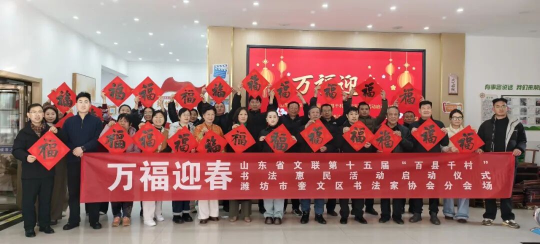 在潍坊市奎文大书房,潍坊市文联相关领导、潍坊市书协主席团成员以及书协会员等二十余人参加了分会场启动仪式。潍城区、奎文区、高新区、峡山区、青州市、寿光市、寒亭区、诸城市、高密市、昌乐县、坊子区、滨海区、临朐县、昌邑市、安丘市等15个县市区书协在各县市设立17个分会场并同时启动。共发动书法家246人次,为基层群众书写春联6710副,“福”字15310个,其他书法作品5000余件,开设“书法大讲堂”14场,培训基层书法骨干500余人次,惠及书法爱好者、基层群众8000余人。