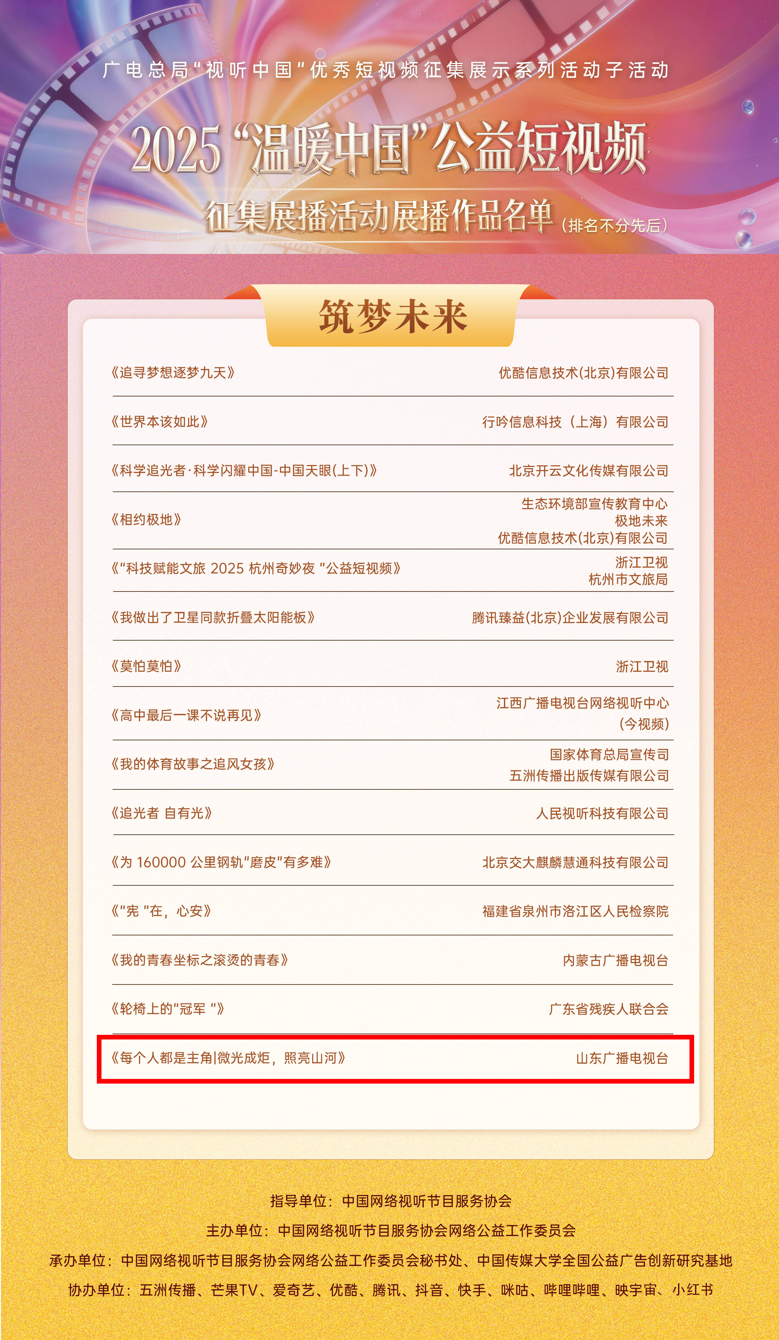 山东广播电视台《每个人都是主角|微光成炬,照亮山河》入选2025“温暖中国”公益短视频“筑梦未来”板块。