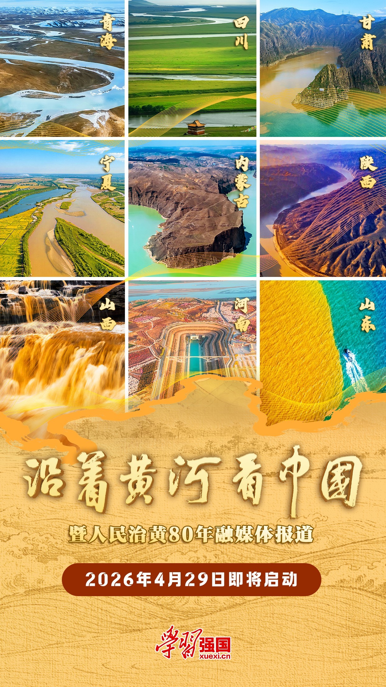 2026年4月29日上午,由“学习强国”学习平台联动沿黄九省区学习平台共同策划的“沿着黄河看中国”融媒体报道,将在河南郑州黄河文化公园启动。报道以“大河永续 幸福长流”为主题,派出多路记者实地走访,通过直播、短视频、图文等融媒产品,溯源九曲黄河文脉、探寻千年文明印记,生动讲述“人民守护黄河、黄河滋养人民”的暖心瞬间,全景展现黄河流域生态保护和高质量发展的实践成效,共绘黄河流域高质量发展壮美画卷。敬请关注!