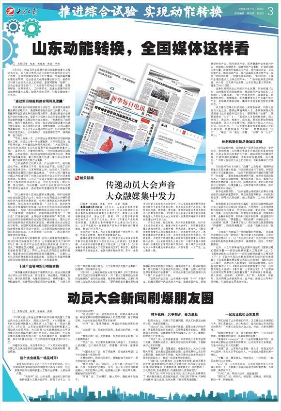 此外,大众日报等省内主流媒体推出的《国家战略的国家考量——新旧动能转换重大工程述评(上)》《国家战略的山东担当——新旧动能转换重大工程述评(下)》《奋力书写山东解放思想走在前列的壮美诗篇》《在高质量发展征程上再创山东辉煌》《戳中山东人心窝子 点燃山东人新希望》《新旧动能转换,山东各地打算这么干》《展开新旧动能转换重大工程 山东要实现五大突破》《春天里 山东再出发》《“全面深化改革开放聚焦聚力高质量发展”专家解读》等报道,被人民网、新华网、光明网、央广网、央视网、中新网、东方网等众多新闻网站、客户端、微信公众号等广泛转载,引起社会各界高度关注。