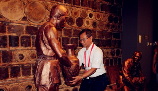 讲解员告诉采访团,展线总长约2000米,陈列展品跨越上下一万年,展示古今中外各类陶瓷琉璃精品1.6万余件。展馆地上五层,地下一层,馆内设25个展厅,分为陶瓷展陈、琉璃展陈和陶琉文化体验互动部分,采用声、光、电、像等最新科技手段,全方位多角度立体式展示了陶瓷、琉璃的发展历程,堪称国内一流专业陶瓷琉璃馆。