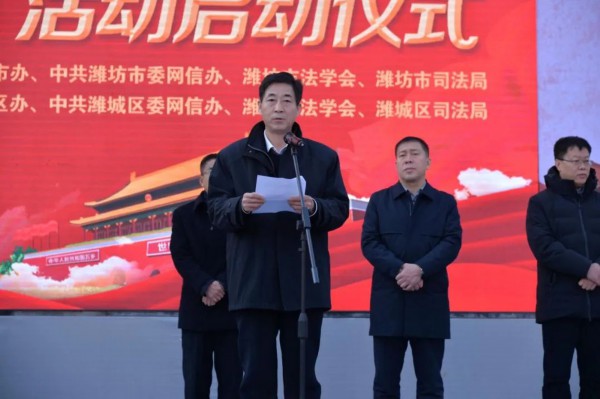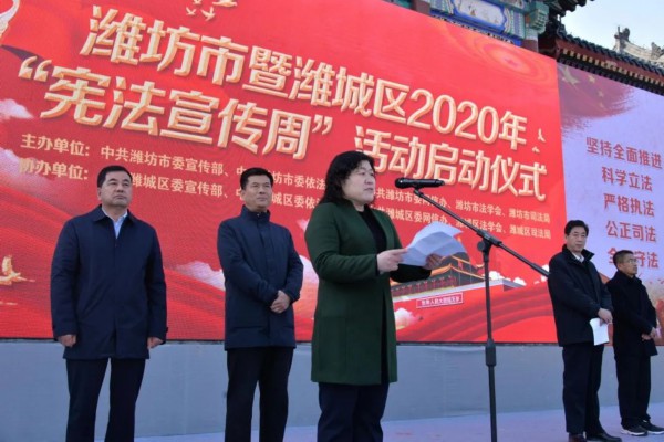 11月30日上午,潍坊市暨潍城区2020年“宪法宣传周”活动启动仪式在潍城区十笏园文化广场举行。市委宣传部副部长、网信办主任范明涛主持启动仪式,潍城区委常委、政法委书记、区委依法治区办主任潘立东致辞,市司法局党委书记、局长,市委依法治市办副主任孙淑芳出席并讲话,市法学会副会长、秘书长葛金军,市司法局党委委员、副局长袁岗,潍城区政府副区长、区公安分局局长韩晓军出席活动。潍坊市、潍城区有关部门单位负责同志,律师代表、干部群众代表、普法志愿者和各界人士代表共80余人参加启动仪式。